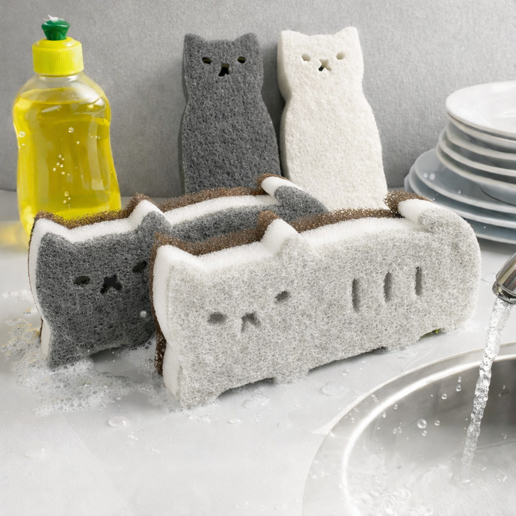 Gör diskhon lite trevligare med en disksvamp i kattform. Den är ungefär 14 × 7 × 3 cm och har två sidor: en hårdare skrubbsida när det sitter fast ordentligt, och en mjuk sida för den vanliga disken.