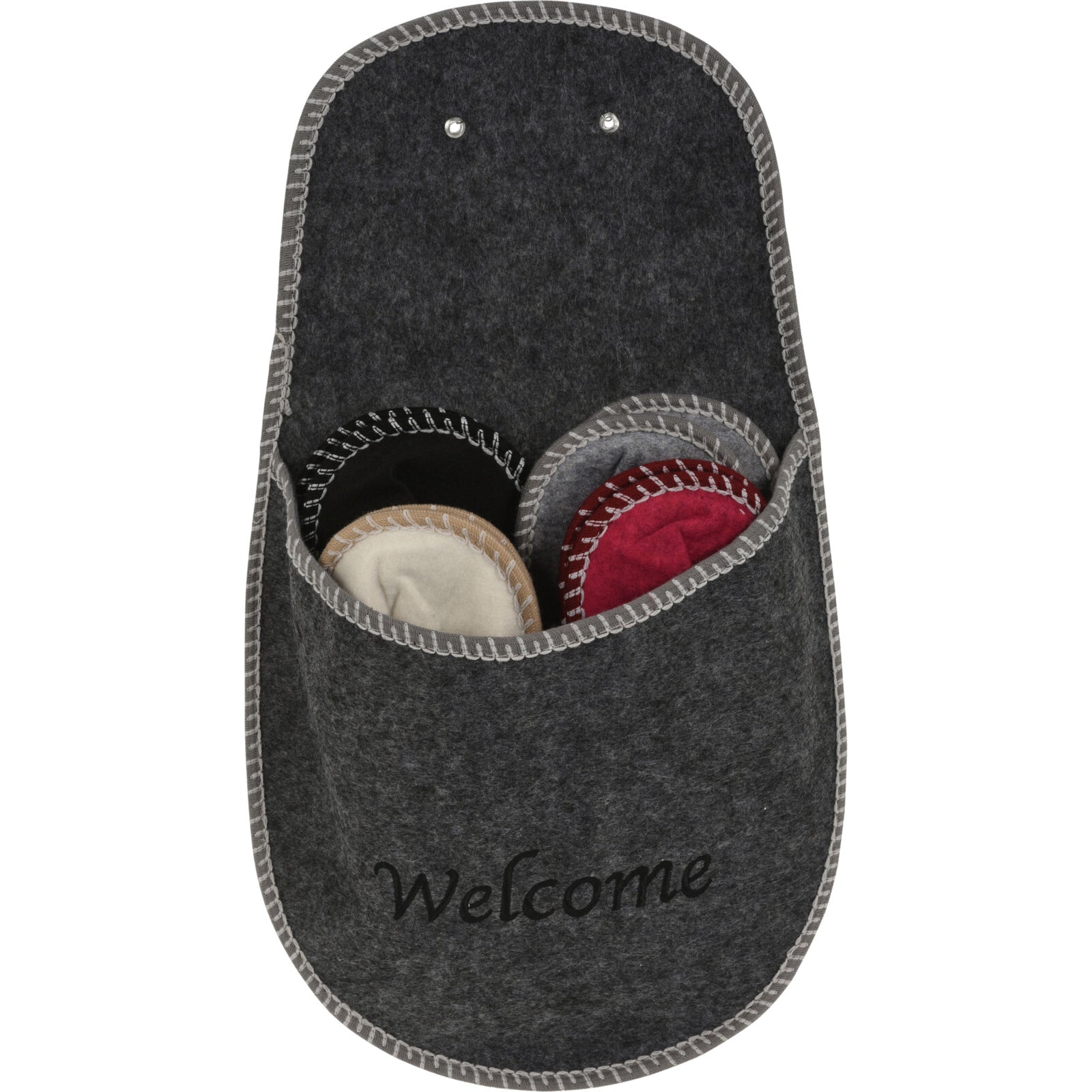 Setet innehåller fyra par gästtofflor i olika storlekar samt en grå hållare, båda i filtmaterial. Tofflorna kommer i grått, rött, svart och vitt, vilket ger ett dekorativt och stilrent uttryck samtidigt som de är enkla att förvara.