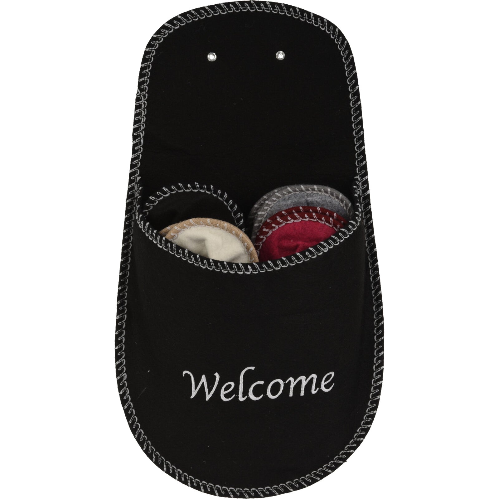 Setet innehåller fyra par gästtofflor i olika storlekar samt en svart hållare, båda i filtmaterial. Tofflorna kommer i grått, rött, svart och vitt, vilket ger ett dekorativt och stilrent uttryck samtidigt som de är enkla att förvara.