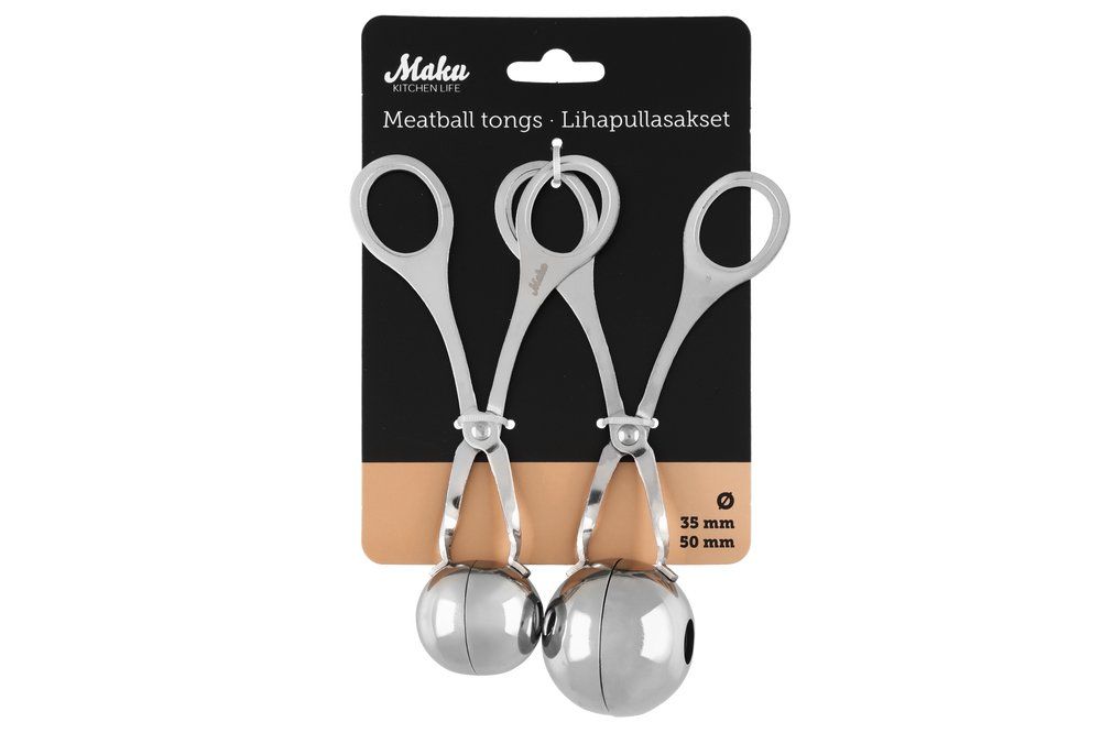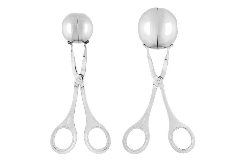 Köttbulletångar som gör det enkelt att forma jämnstora köttbullar snabbt och prydligt. Saxen hjälper till att få runda, enhetliga bollar utan onödigt kladd. Ett tips vid användning är att doppa saxen i kallt vatten innan du börjar, vilket kan minska risken att färsen fastnar och gör arbetet smidigare.