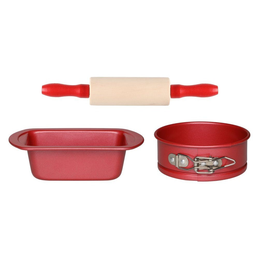 Ett litet bakset i juligt rött som passar för mindre bakprojekt och smidigare förvaring. Setet innehåller en brödform på cirka 17,5 × 10,5 × 5 cm, en form med lös botten (cirka 12,5 cm) samt en kavel. Tillverkat i kolstål och bok i färgen röd.