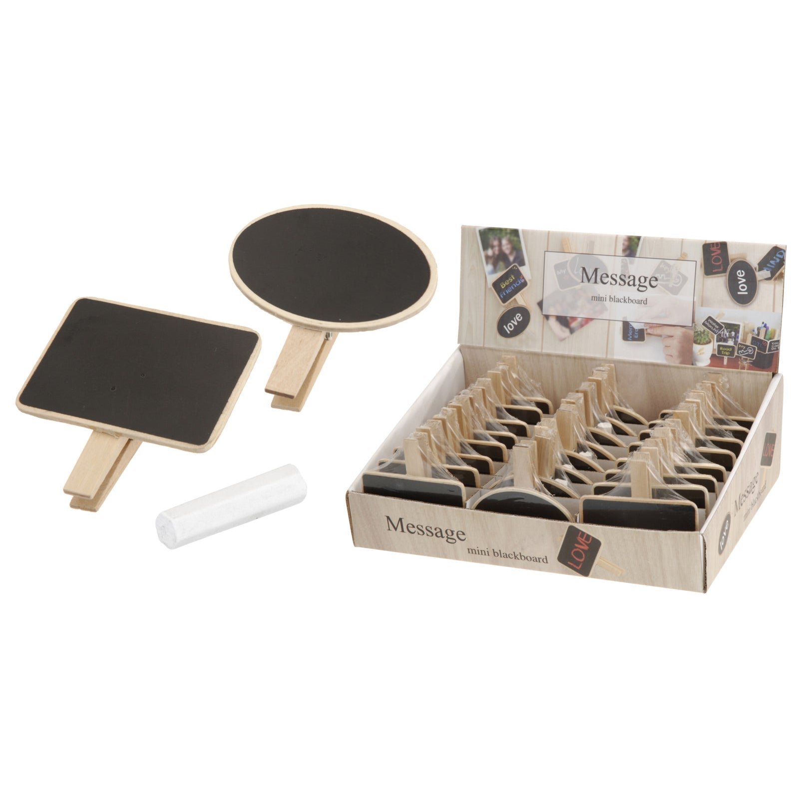 På baksidan finns en klämma som gör det enkelt att fästa tavlan nästan var som helst. Setet innehåller även en liten krita, så den kan användas direkt.