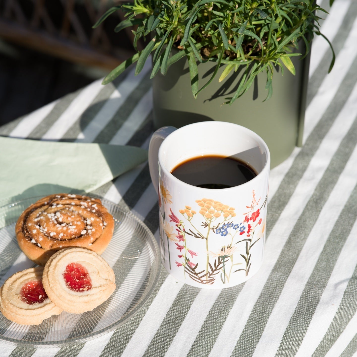 Porslinmugg med ett vackert sommarmönster i vintage stil, med olika växter som för tankarna till blommande ängar och grönska. En dekorativ mugg som fungerar fint både till kaffe och te.