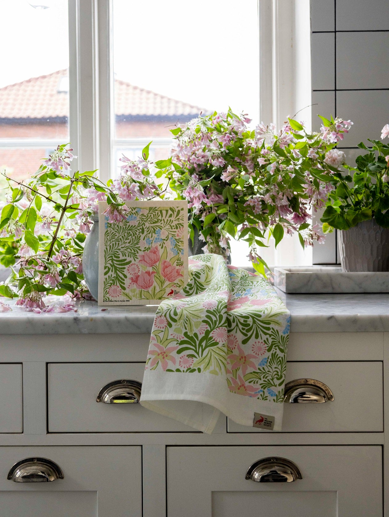 Ett stilfullt set med kökshandduk och disktrasa i Bower-mönstret av William Morris. I klassisk Arts & Crafts-stil ger mönstret ett levande men harmoniskt uttryck som fungerar i både moderna och mer traditionella kök.