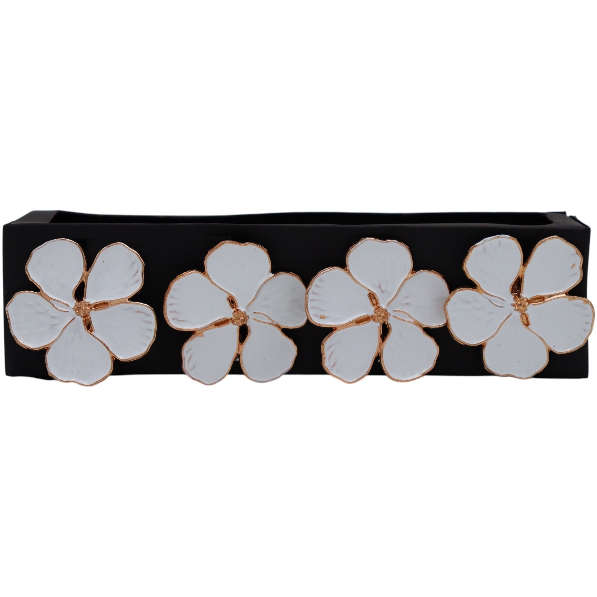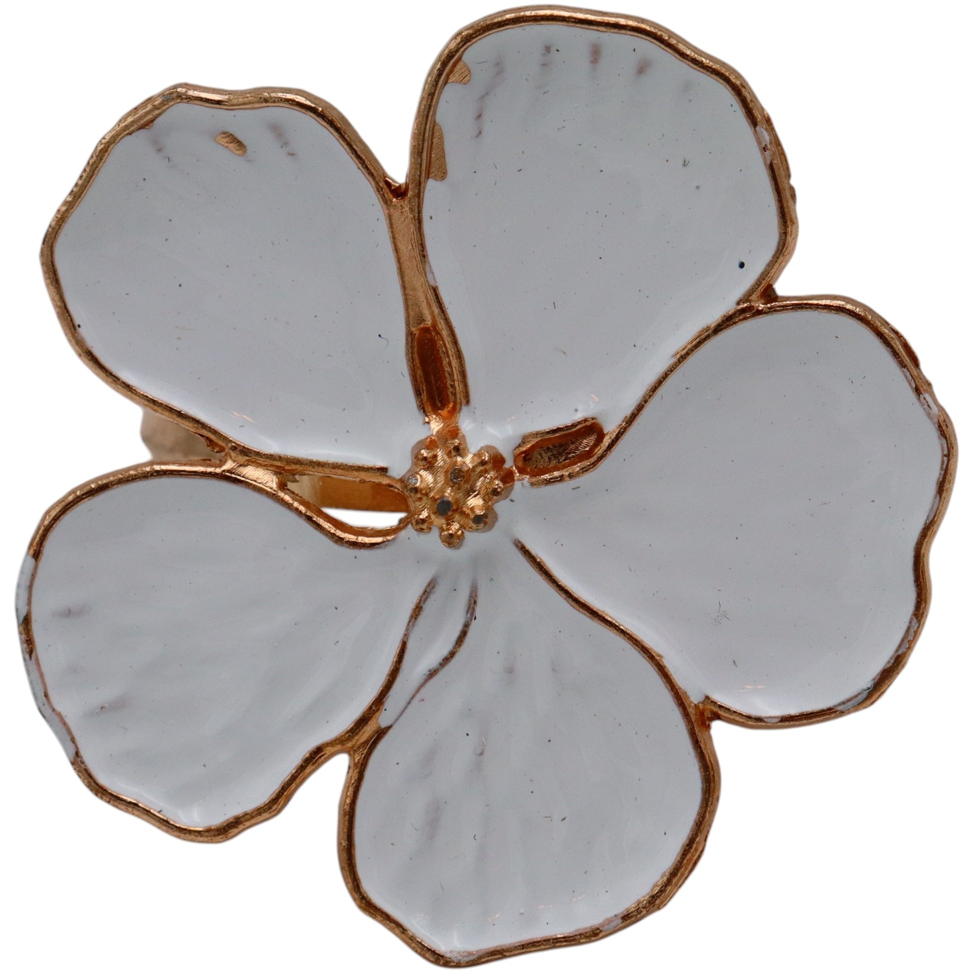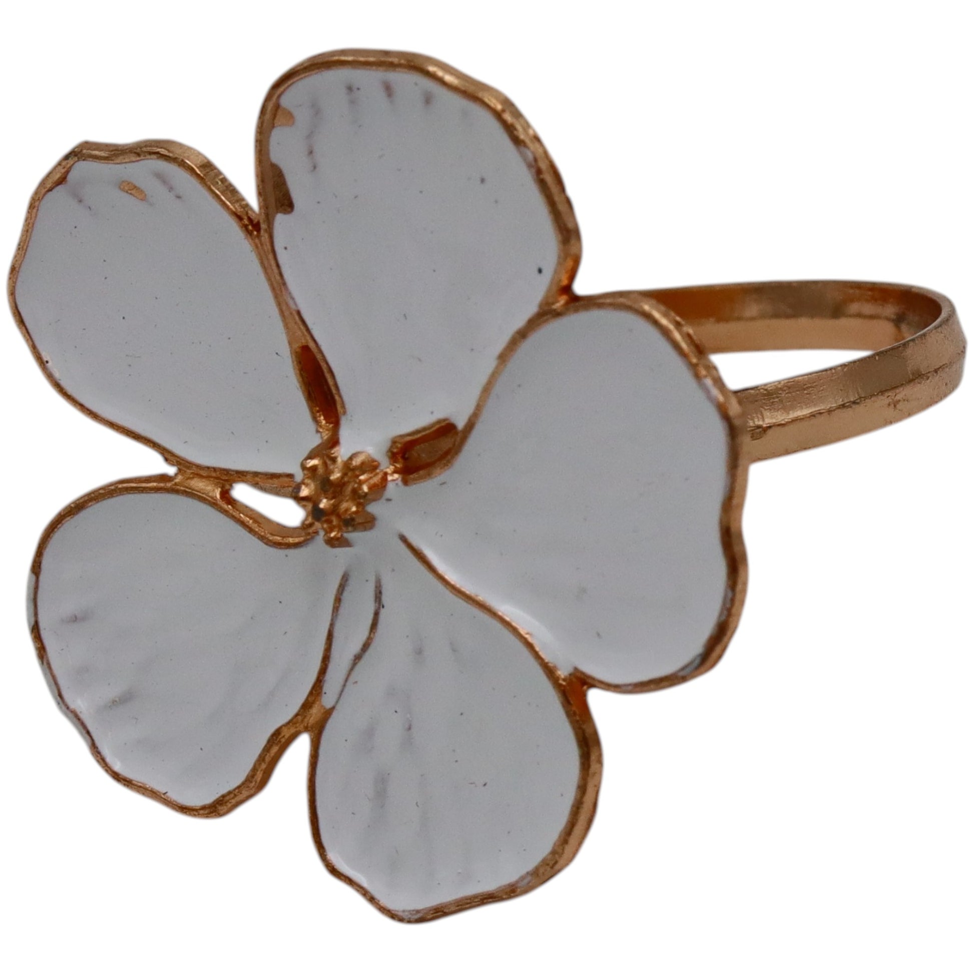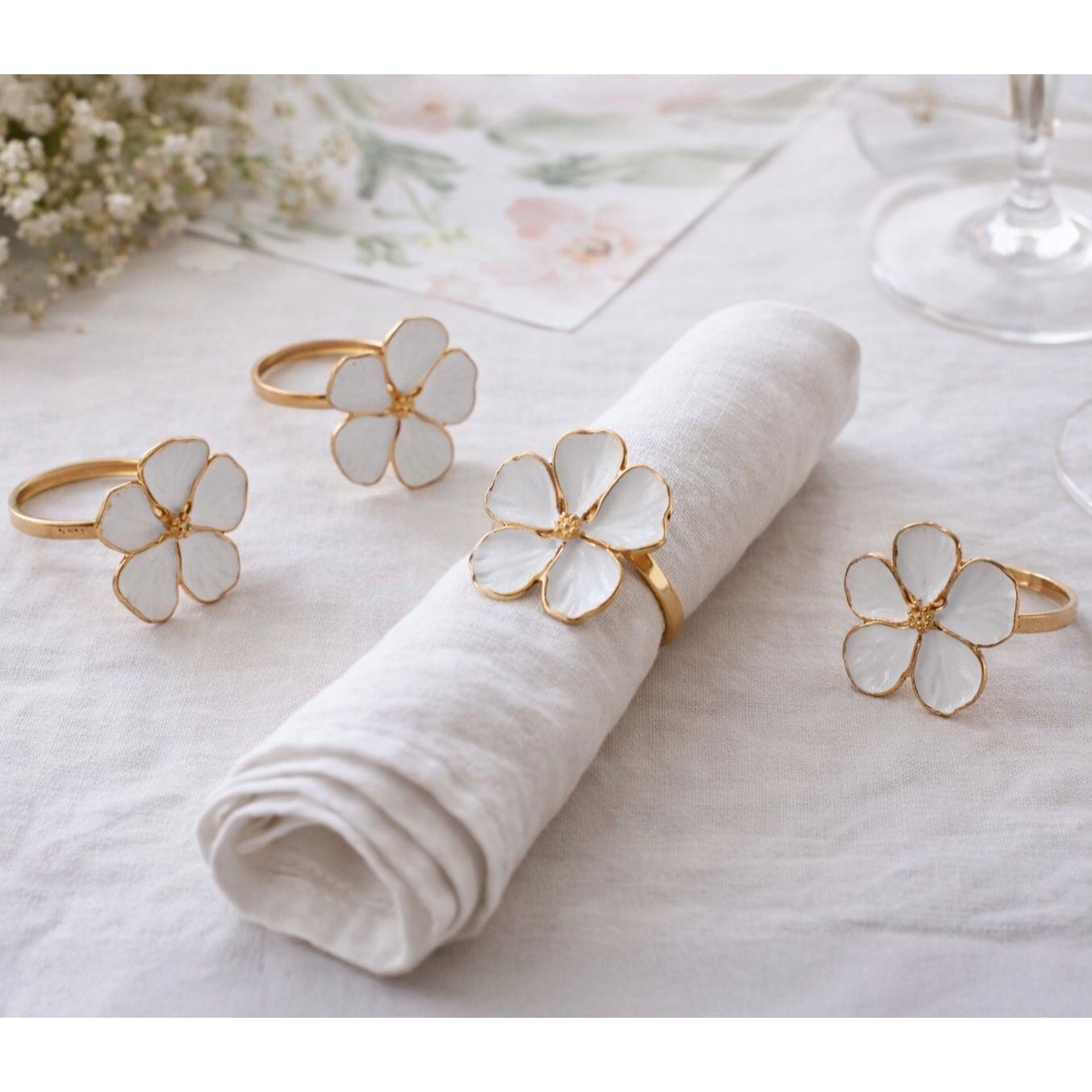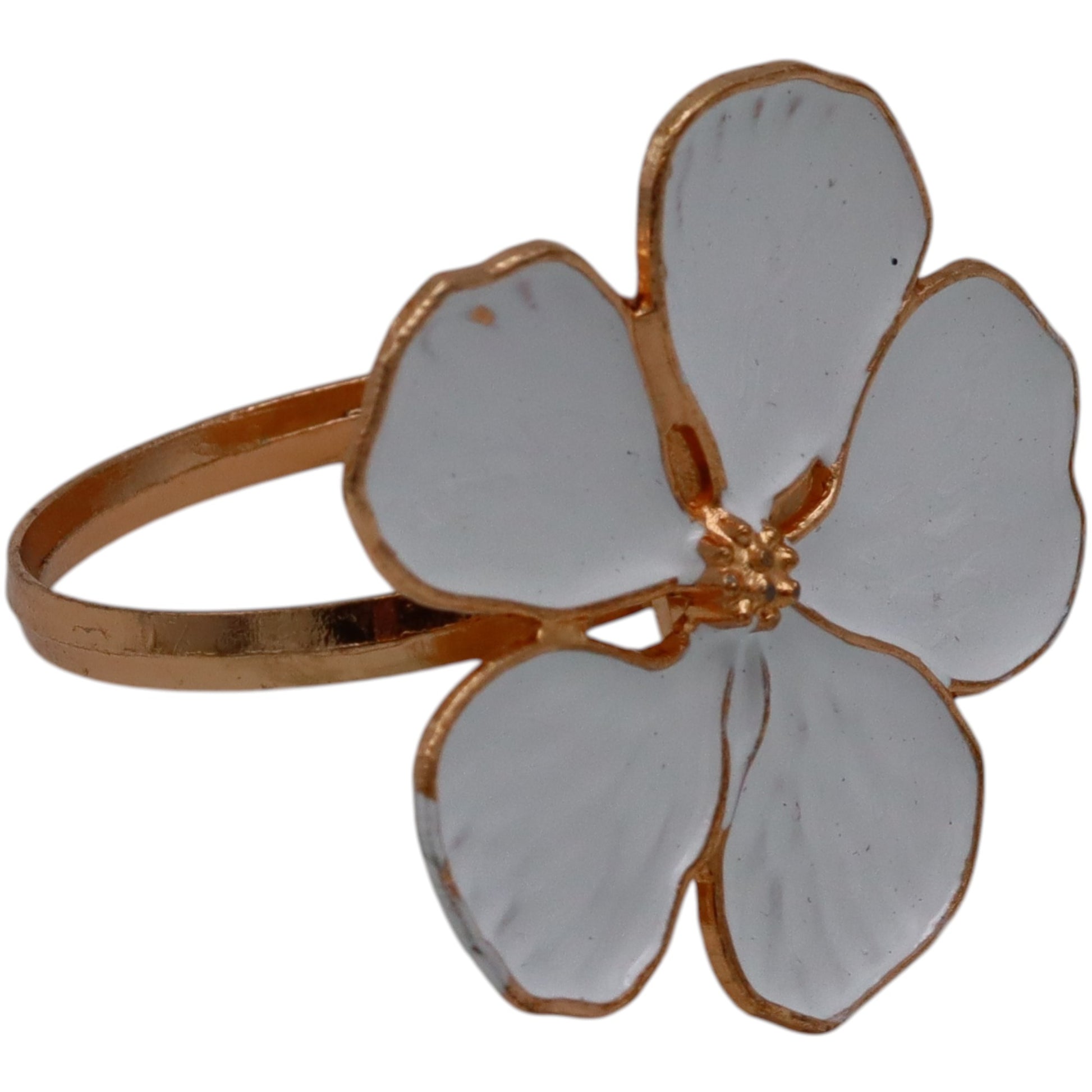 4 stycken servettringar i metall med en elegant blomdesign. Varje ring har en diameter på cirka 3,5 cm. Blomman är vit, medan ringen och blomkanten har en guldfärgad ton som ger ett mer exklusivt uttryck vid dukningen.